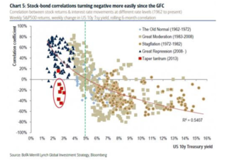 There has been a strong positive relationship between the correlation between stock and bonds and the level of yields. As rates have declined the stock-bond rate correlation has moved from negative to positive. This is a phenomenon which has been found around the world in all major markets. Many analysts have measured this through equity and bond returns (prices) which will show a strong negative correlation. The secular decline in inflation has pushed down bond yields during a time of long-term equity gains. Similarly, the decline in real yields through a fall in bond risk premiums has also been associated with an increase in stocks.