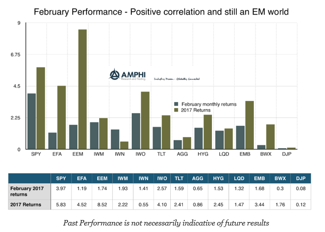Style returns were all positive for February with the largest gain for the large cap US SPX index. International stocks lagged given the increase in the value of the dollar. Small and mid-cap indices did not gain as much in February after stronger movements over the last few months since the US election.