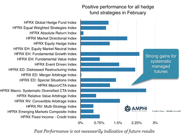 All hedge fund strategies gained for February with especially strong performance for systematic CTA’s and fundamental growth strategies as measured by the HFR indices. Managed futures showed gains because both equities and fixed income markets trended higher for the month. The fundamental growth strategy seemed to be positioned to take advantage of the global reflation trade. Other winners included market directional and distressed restructuring strategies.
