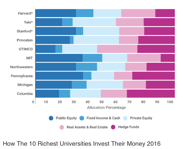 This above chart from thetrustedinsight.com provides an interesting tale about asset allocation for large endowments. Forgot about the traditional 60/40 stock/bond mix. Forget about the 50/30/20 stock/bond/alternatives mix. If you don’t need liquidity, as is the case for the endowment portfolio allocations, a mix between liquid and illiquid is a better base framework. Hold private equity and real estate as core allocations. This core is for long-term appreciation and cash flow greater than bonds, but is generally illiquid. Take money from fixed income and cash. Take funds from public equities and use hedge funds, which may have mixed liquidity, as an additional return enhancer. The public equity and bond/cash portion of portfolios is between 25 and 50%, while hedge funds are from 7.5 to 32.5% for these key endowments. The majority of their allocations are not with traditional equity and bond beta.
