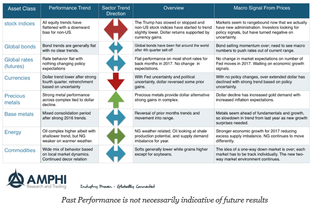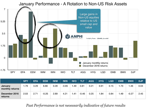 It was a positive month for risky assets, albeit more one of consolidation and than return break-out like what was seen last quester. Global markets outside of the US, especially emerging markets, showed large gains after a weak fourth quarter. The dollar gains post-election were partially reversed which added a tailwind to non-dollar investments of about 2%. After accounting for currency changes, developed non-dollar returns are back in-line with the US.
