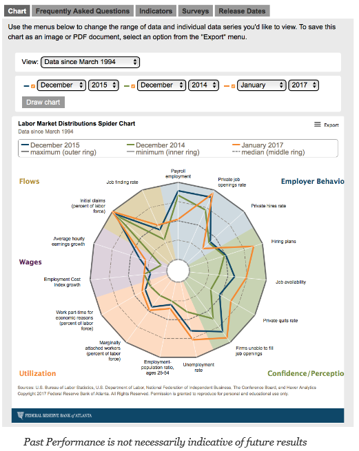 There are a lot of labor statistics to analyze to measure what may happen with fed policy and interest rates. One of the key problems is trying to place all of this information on a single page or in a visual format that can do proper comparison with the past and provide analysis of the present. The Atlanta Fed has achieved that goal with their new labor spider graph.