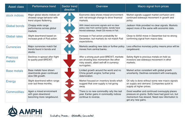 The reason for the lackluster performance of managed futures is clear from a review of trends for the major sectors. For stock indices, global bonds, and currencies, the big three asset classes, there were no clear trends for the month. Global rates, energy, and commodities also showed sideways movement albeit with a slight downward tilt. The only sectors that showed any real direction were precious and base metals that moved lower.