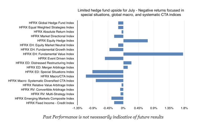 Hedge fund returns for July were generally negative with the only exceptions being equity hedge and fundamental value strategy indices. The class of uncorrelated hedge funds styles, event driven and special situations, under performed. Defensive styles like systematic CTA and global macro also posted negative returns.