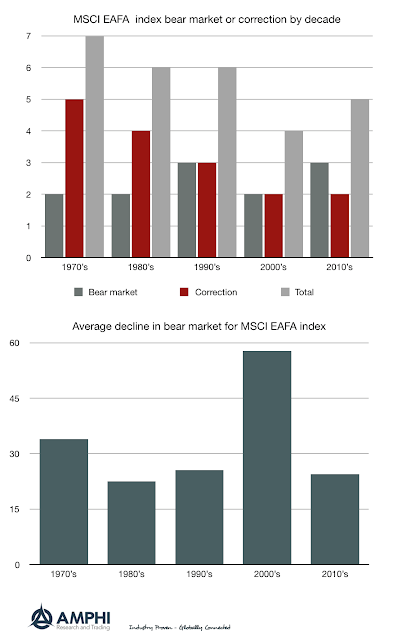 How often should you expect equity bear markets? Using the global diversified MSCI EAFA index, we calculated the number of bear markets, moves down greater than 20%, and corrections, move down greater than 10%, since 1970 by decade. (Hat tip to Ben Carlson of “A wealth of Common Sense” for providing the raw data for developing these charts.) The numbers suggest that you will get 2-3 bear markets per decade. The number of corrections or bear markets total 4 to 7. The average decline of the bear markets is variable. The 2000s decade was horrible with two bear markets more than 50%.