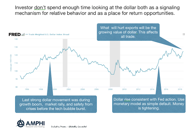I have fewer concerns this week; however, there is significant risk with inflation. Inflation is growing around the world. We are pass 2% in the US by any number of measures. Let the overshoot begin. There is little reason so see the Fed changing their behavior and there is a stronger case for further money reduction around the world. The trade rhetoric is still high and there is general agreement that further trade action will slow growth, yet we continue to move down this path.