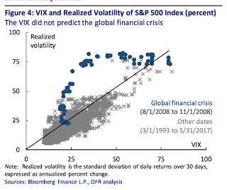 A provocative chart from the research piece The Volatility Paradox: Tranquil Markets May Harbor Hidden Risks by the Office of Financial Research Markets Monitor shows the poor forecasting of volatility when there is a regime change. Of course, tranquil markets harbor hidden risks. Low volatility is pricing in a lack of imagination of what the future may hold. The markets usually say that tomorrow’s change will be represented by the deviations of yesterday. We have learned from reading Minsky that low volatility will lead to risk-seeking behavior as investors reach for yield, employ leverage, and become complacent. Hence, a shift in regime will lead to more dramatic change in volatility.